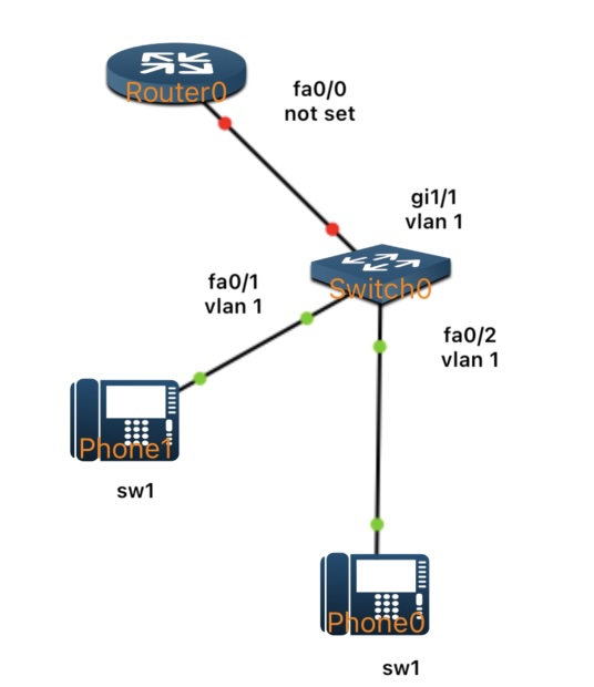 By the end of the lab, two Cisco IP phones will be fully registered to the router, receive their IP configuration via DHCP, and be able to call each other using assigned internal extension numbers.