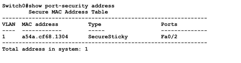 On our last tutorial we configured port security on a switch, let’s verify the configuration: